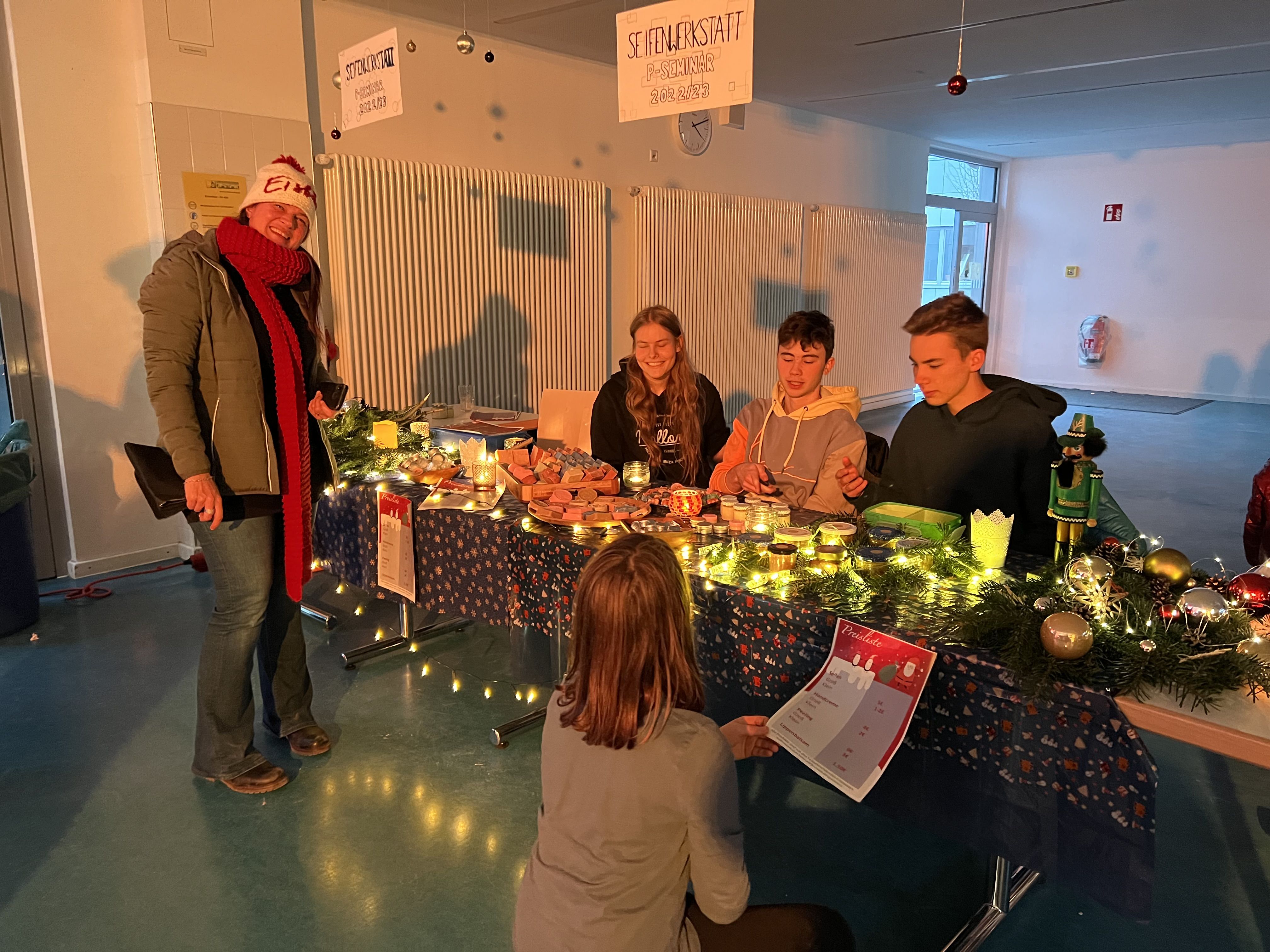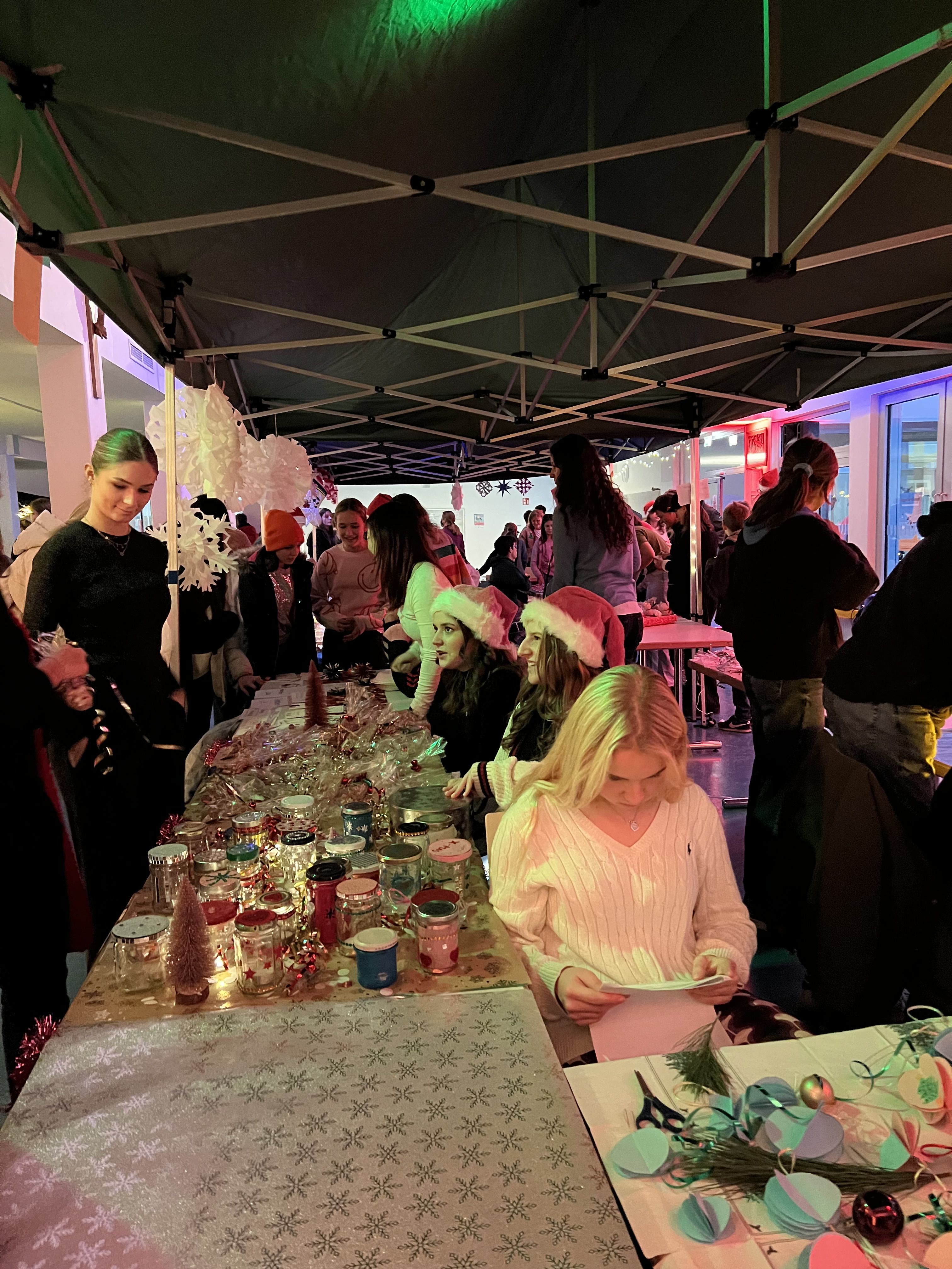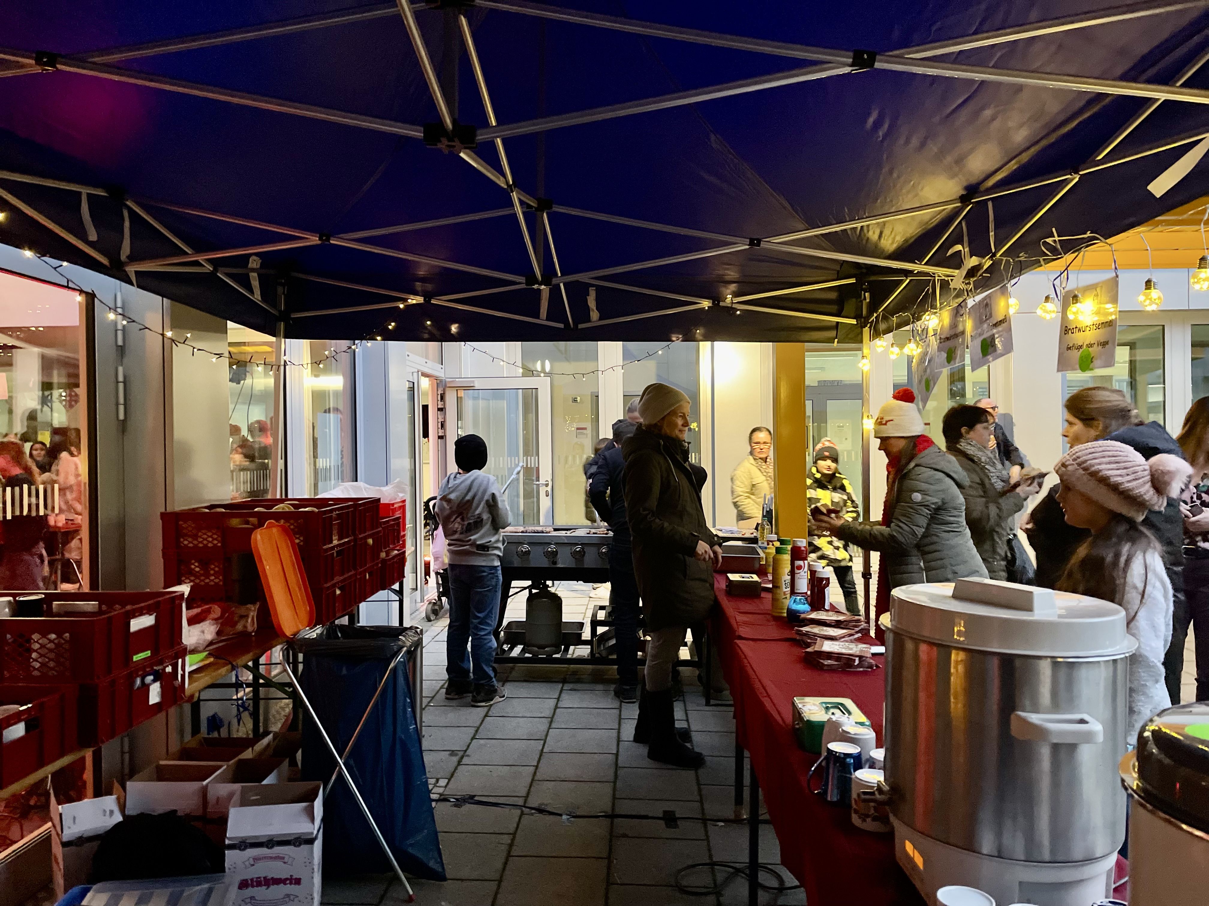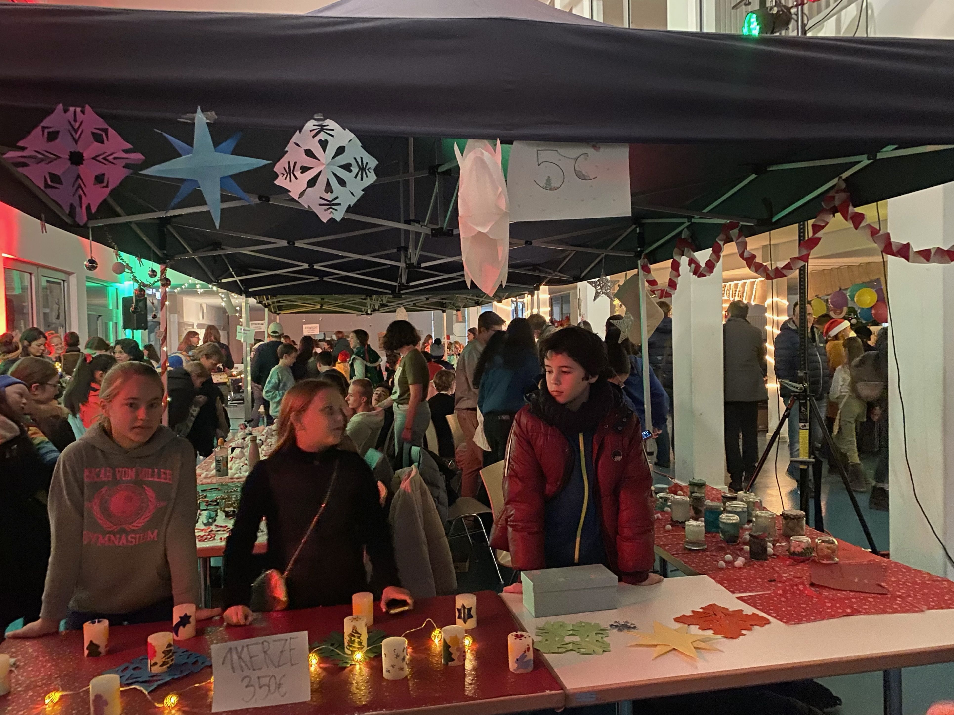 Auf unserem wunderschönen, liebevoll dekorierten und von engagierten Schülern ausgerichteten Adventsbazar gab es Bastelarbeiten der 5. + 6. Klassen und ihrer Tutoren, selbstgemachte Seifen des P-Seminars, eine Foto-Box mit rotem Teppich, Zuckerwatte, Crépes, Chilli sin Carne, Sport- und Oskarklamotten, Life Musik und vieles mehr - und natürlich den Glühwein/Punsch und Würstel Stand des Elternbeirates.