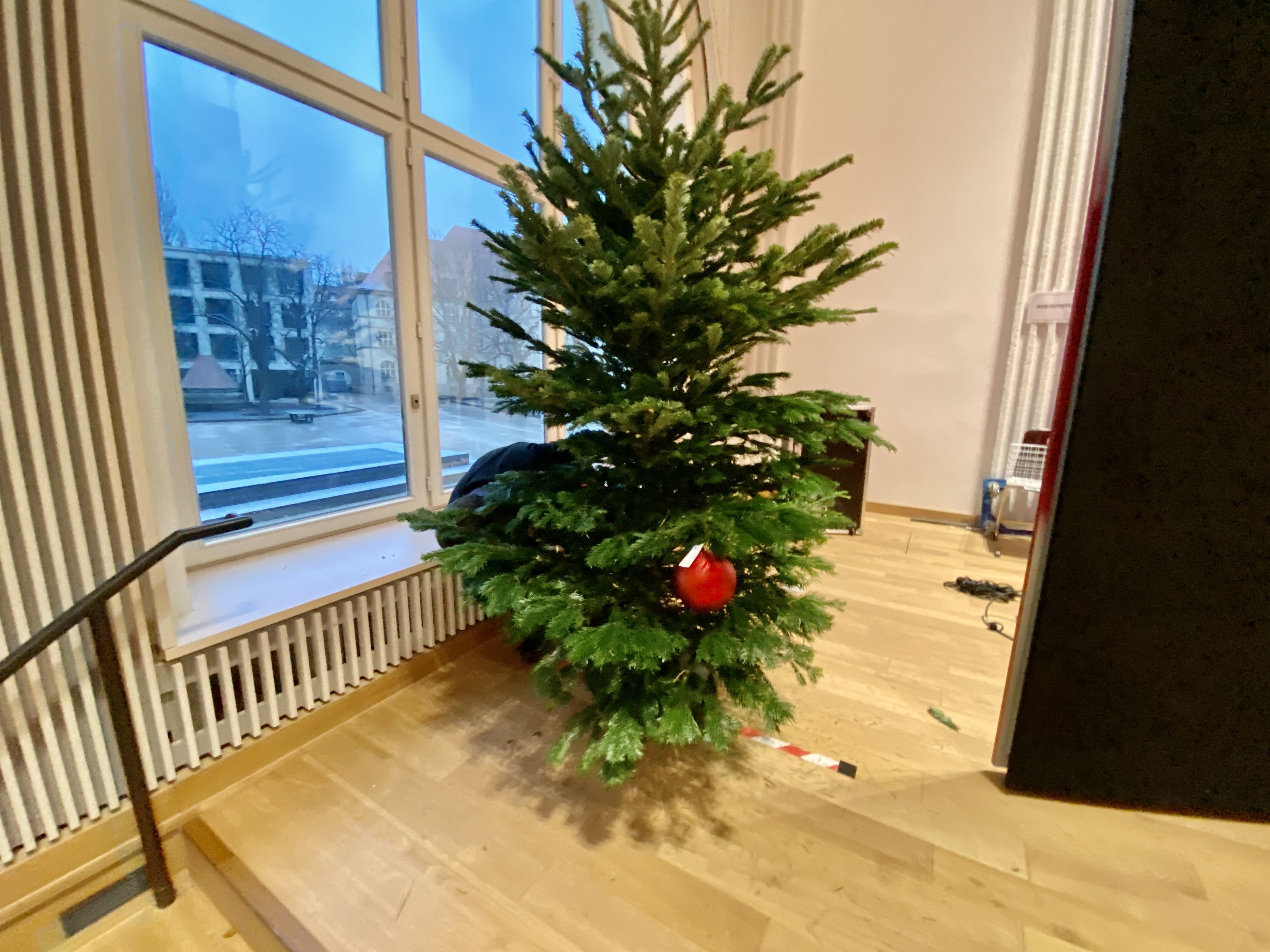 Am 22. November um 16:00 Uhr war es so weit: Treffpunkt Aula, neben der Bühne – genau dort, wo der Weihnachtsbaum in diesem Jahr stehen sollte, mit Blick in den Schulhof.