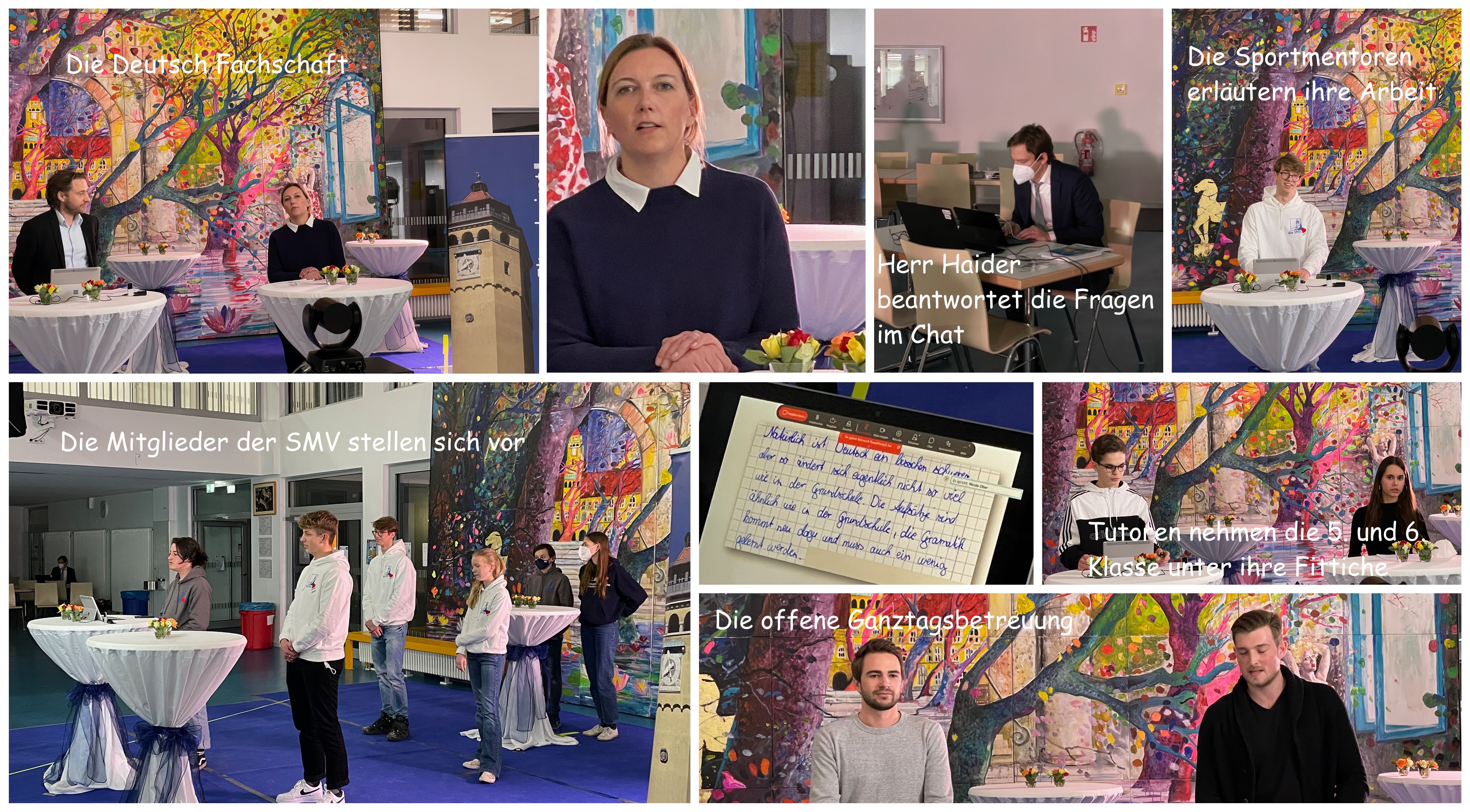 Normalerweise! Aber in Zeiten der Corona-Pandemie ist alles anders … auch der Oskar-Infoabend konnte am 9. März nicht so stattfinden wie gewohnt. Die Schule hat statt dessen sozusagen gezeigt, was sie in einem Jahr seit dem ersten Lockdown alles gelernt hat – und ein digitales Experiment gewagt (bei dem, so viel sei ehrlich zugegeben, nicht alles so lief wie geplant und geprobt): Der Info-Abend wurde „live“ aus der Schule übertragen; auf einer Bühne in der so genannten „Mensaula“ (Mensa + Aula in einem) unseres Interim-Gebäudes gab es Auftritte und Beiträge unterschiedlicher Sprecher:innen und Gruppen; auch „Filmeinspieler“ waren dabei … und individuelle Fragen wurden (wie im Webinar) nebenher im Chat beantwortet. Sogar der Mathe-Sketch wurde aufgeführt! Auf das lateinische Theaterstück der fünften Klassen musste aufgrund der Regeln zu Abstand und Personenzahlen allerdings verzichtet werden – genauso wie auf das sonst immer besonders beeindruckenden Chor-Konzert der Viertklässler: Darüber lässt sich nämlich alle (normale) Jahre wieder staunen … was man in einer Schnupperstunde Musik alles lernen kann!