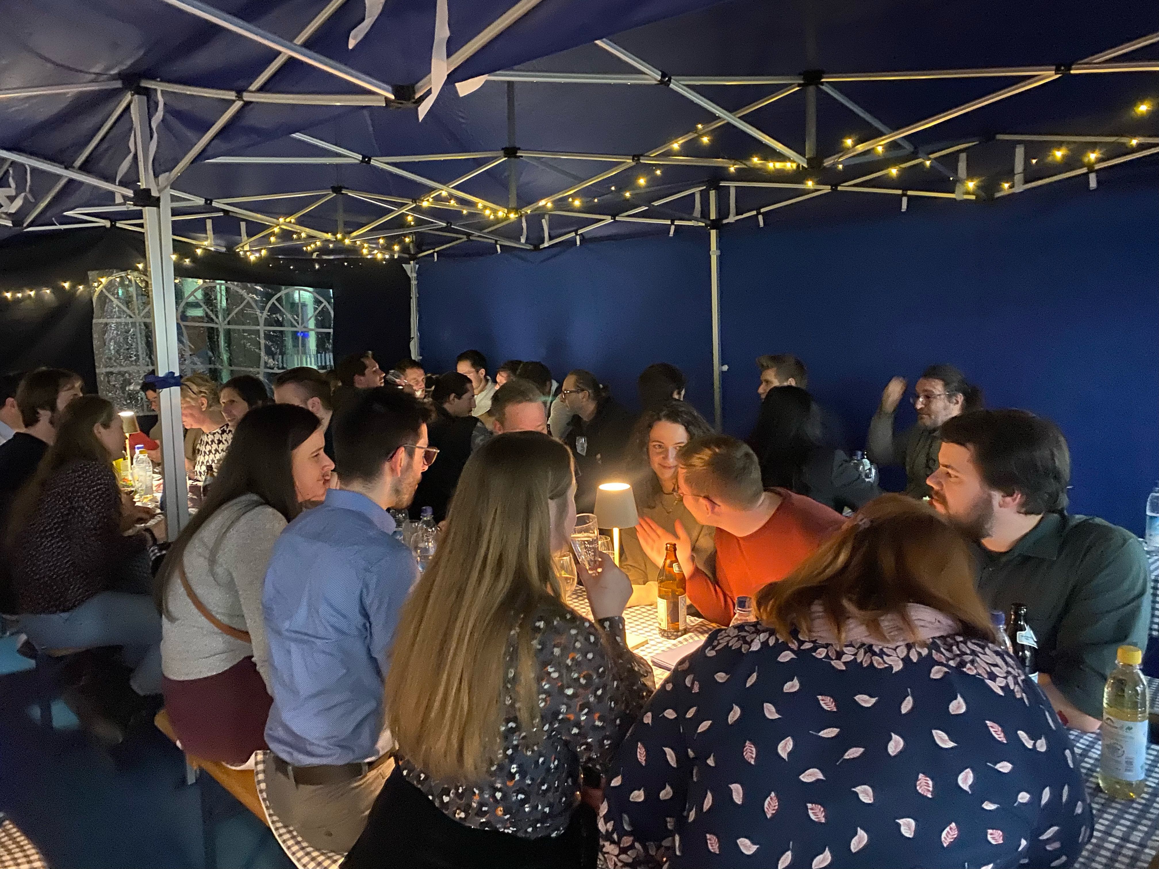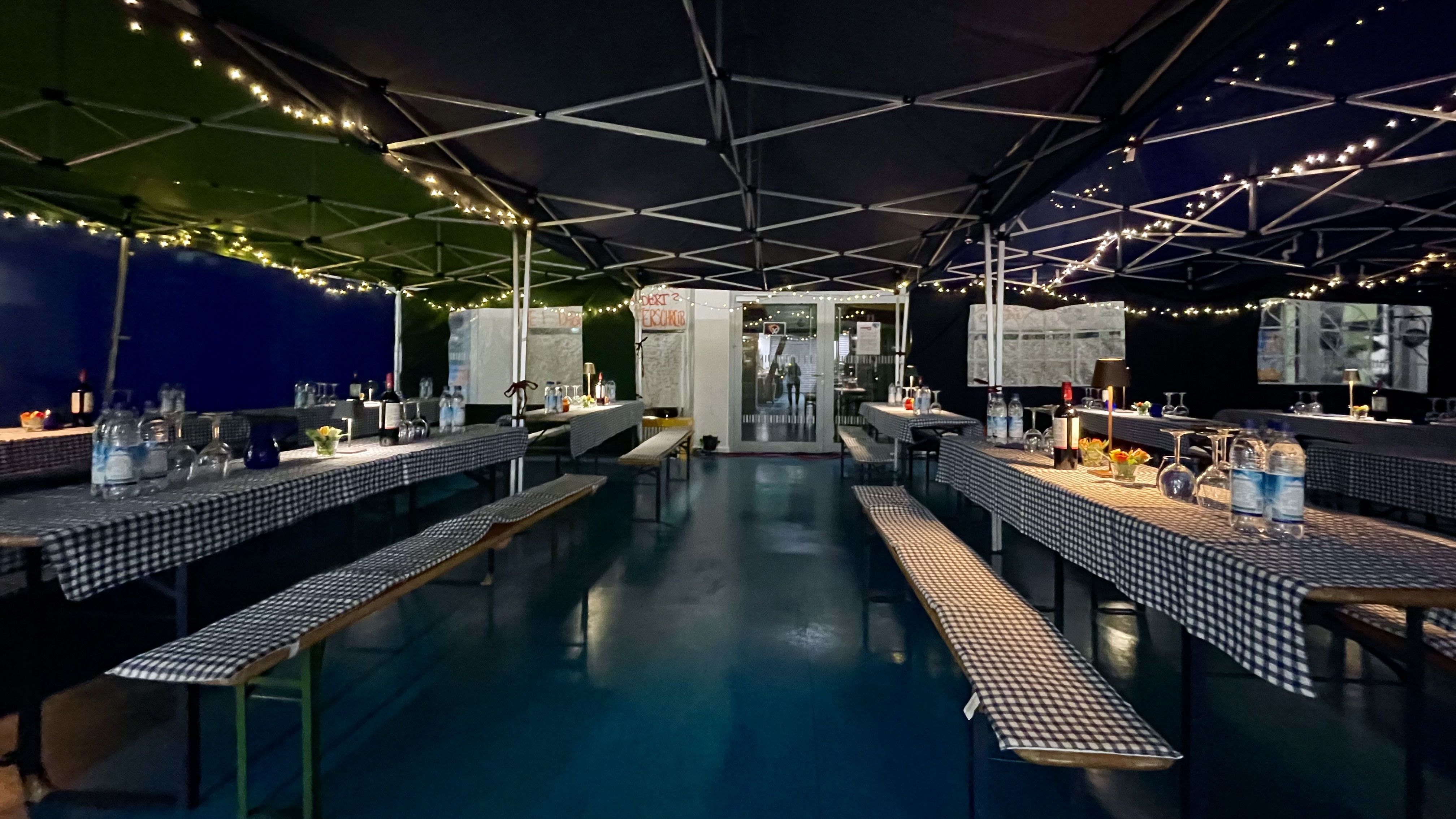 Mitten in der sonst eher nüchtern und neutral gehaltenen Mensaula wurden Pavillions aufgestellt, Bierbänke und Tische gedeckt, Lichterketten aufgehängt und Blumenschmuck verteilt.