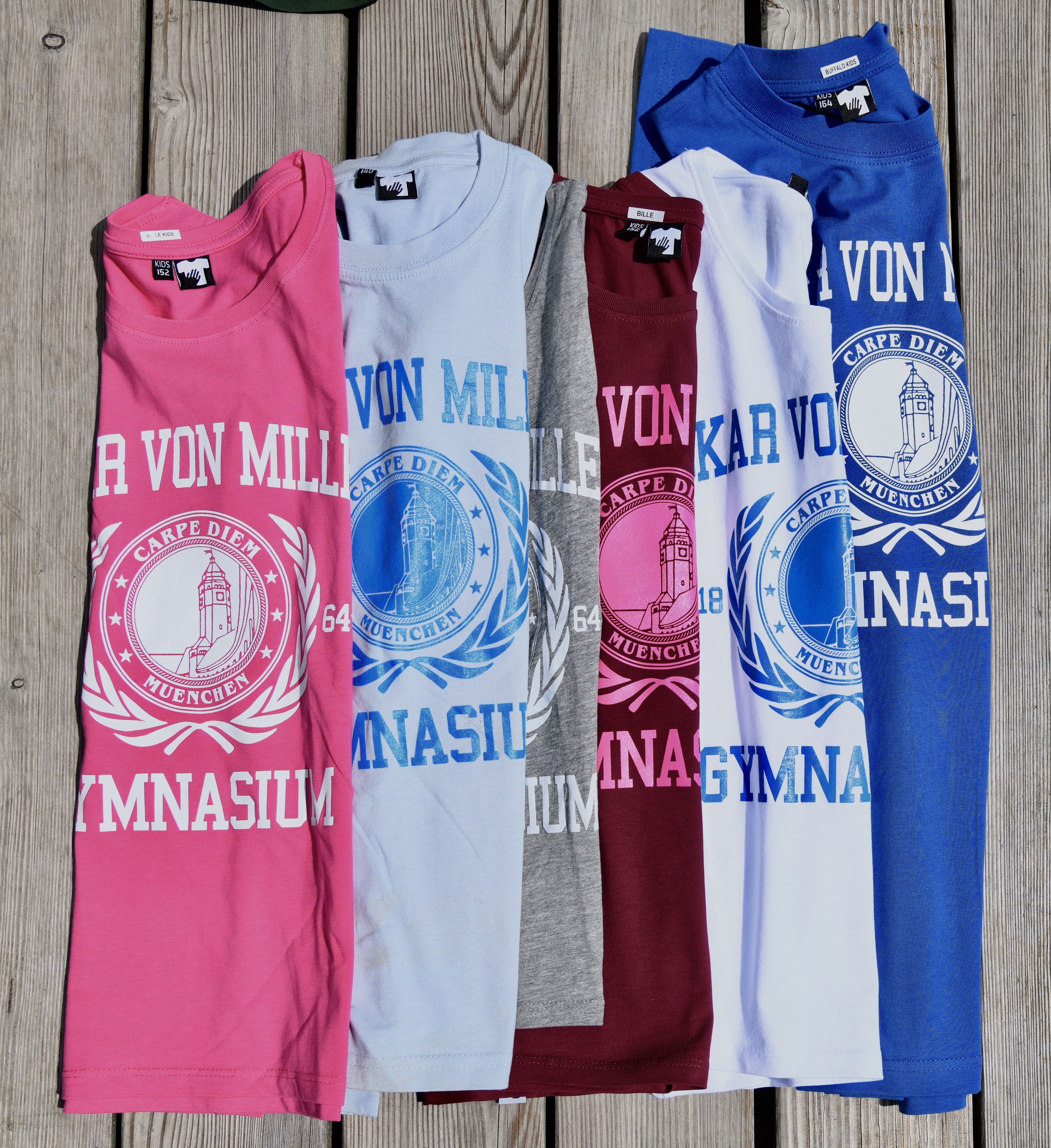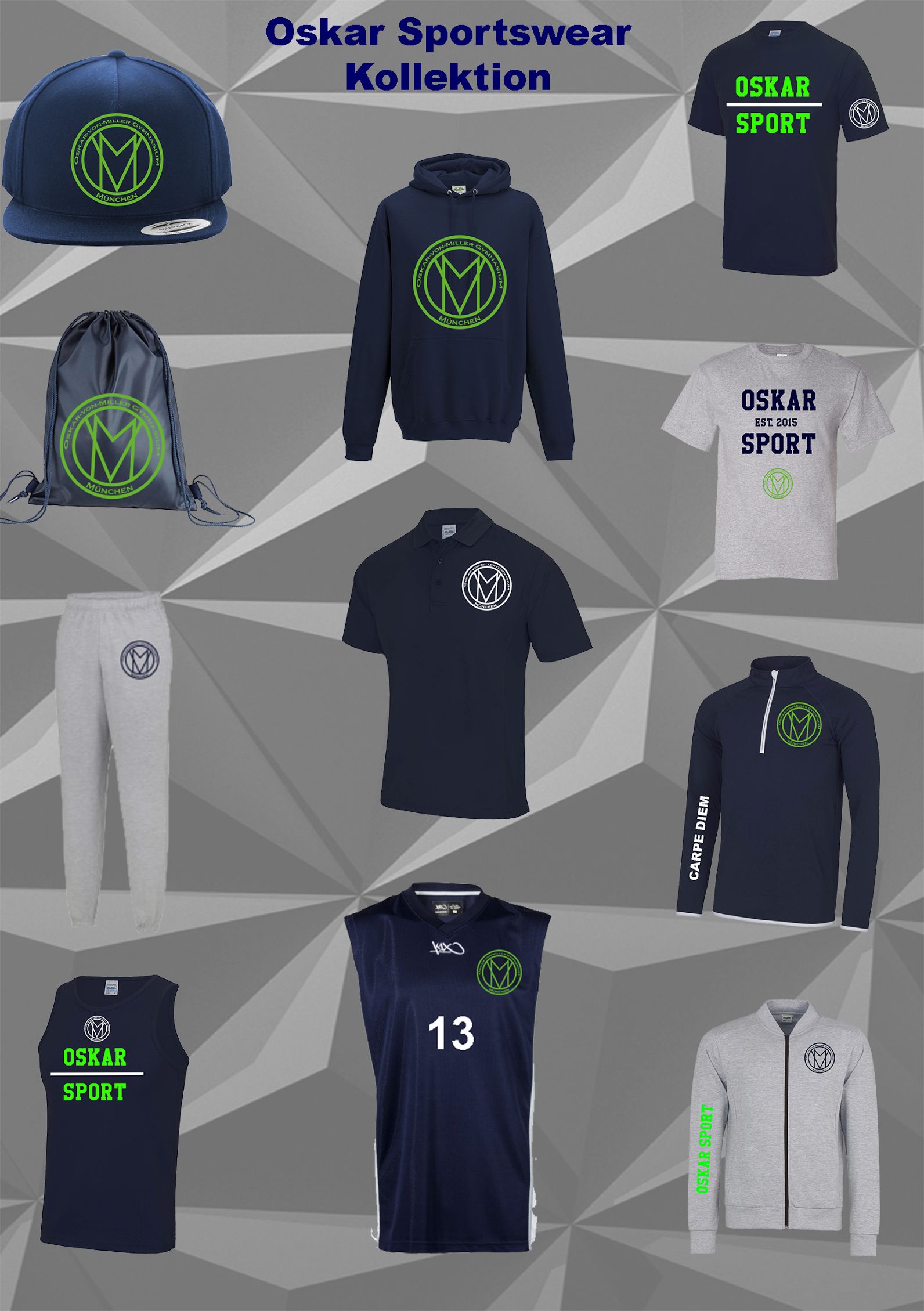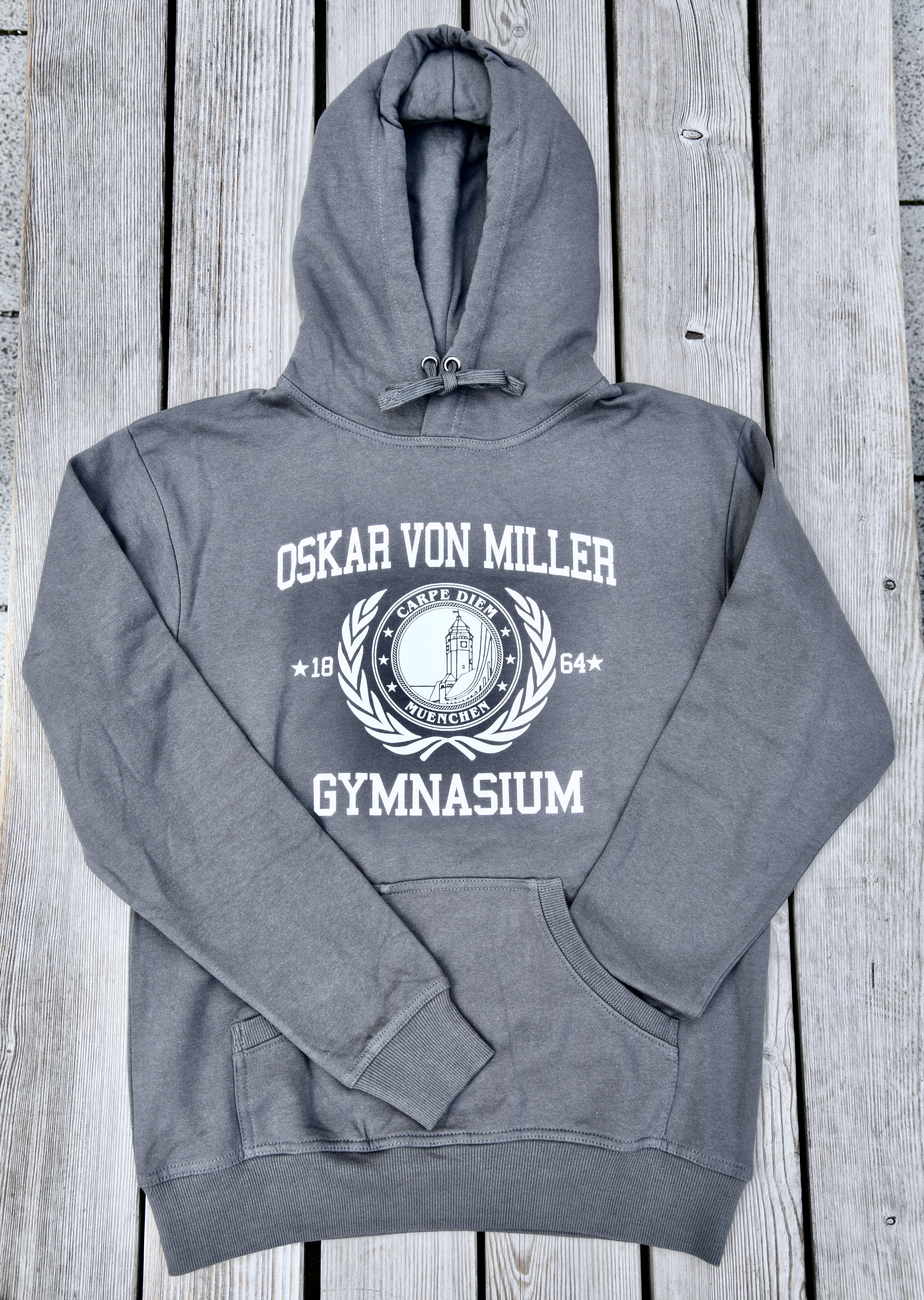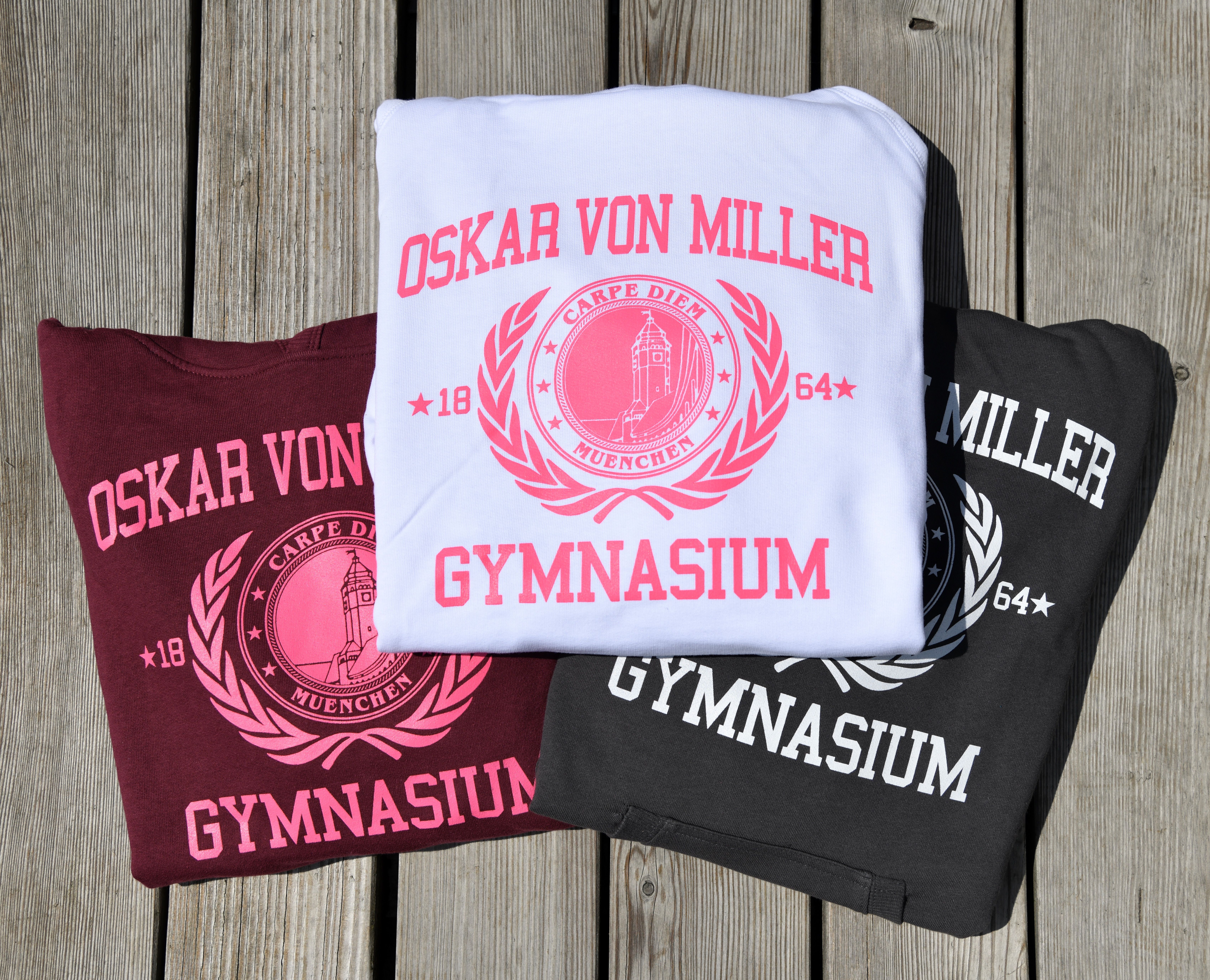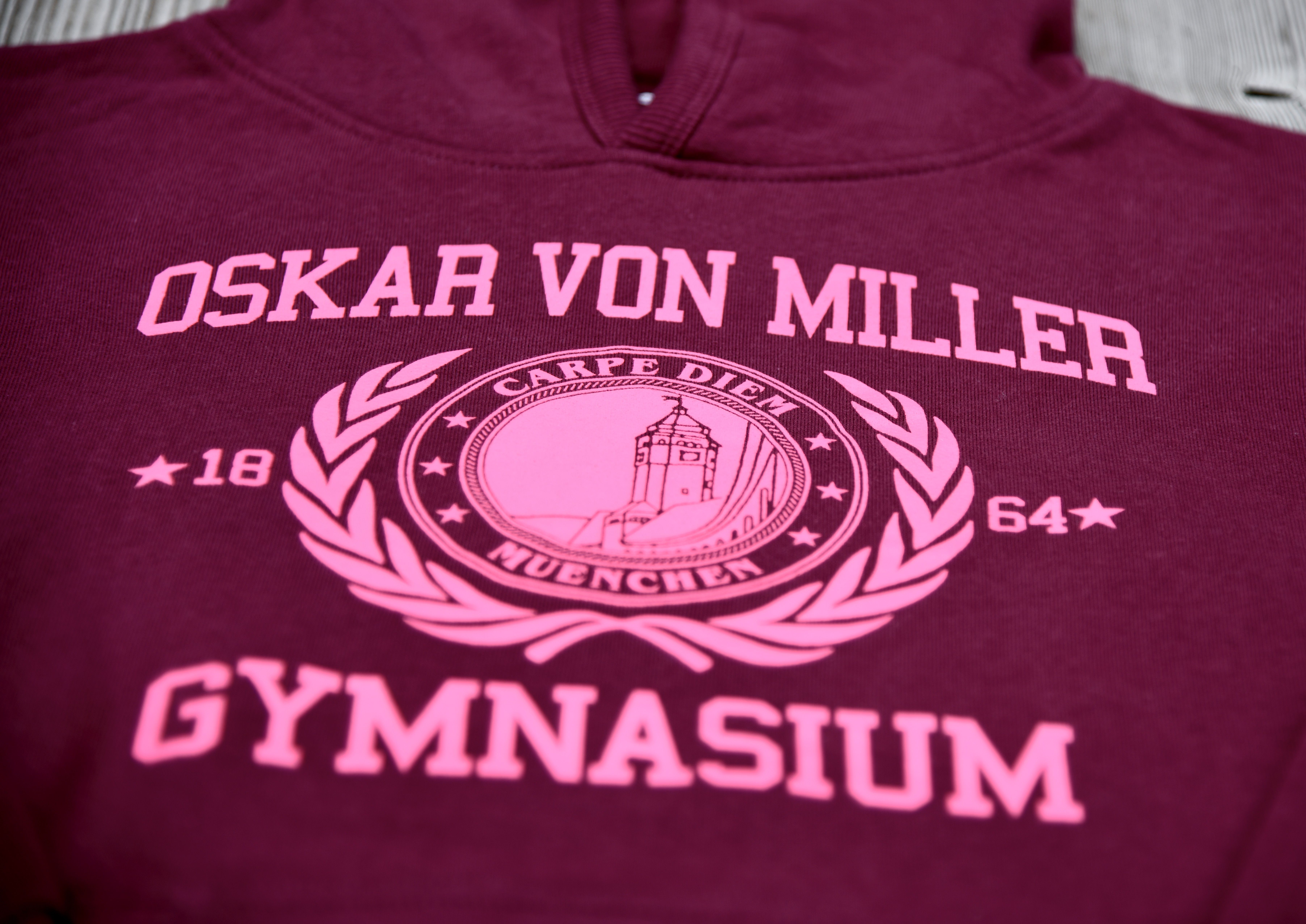 T-Shirts, Hoodies, Hosen: Wer sich dem Oskar-von-Miller-Gymnasium verbunden fühlt, kann das so stolz wie vergnügt zeigen – in der Schule, aber natürlich auch am Wochenende, in den Ferien und nach dem Abitur. Denn die vom Elternbeirat entworfene Oskar-Outifit-Kollektion passt (fast) zu jedem Anlass und ist in vielen verschiedenen Größen erhältlich, sozusagen von der 5. Klasse bis zur Lehrer:innen-Pension. Viele bunte Farben, beste Baumwolle-Qualität, hochwertige Drucke. Erhältlich bei Schulveranstaltungen und -Festen, zu schulfamiliären Preisen. Alle Einnahmen kommen der Arbeit des Elternbeirats und damit unmittelbar den Schüler:innen zugute. Ach ja: ergänzend ist die Oskar-Sportkleidung zu haben – damit man stilvoll und top-motiviert Höchstleistungen erreicht.